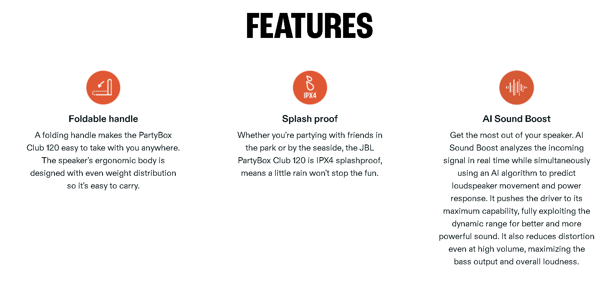The JBL PartyBox Club 120 turns any space to party, and vibe. Powerful JBL Pro Sound fills the air while an entrancing lightshow of starry lights, cool light trails, and strobe effects syncs to your beat. Instantly pair any Bluetooth device and stream your favorite party playlist, or use the mic and guitar inputs to share your own sound. Either way, you can steer the party's flow with fun interactive party effects using the JBL PartyBox app. A folding ergonomic handle makes the PartyBox Club 120 easy to take with you anywhere, and the splash-proof construction means it won't be troubled by a little rain. It delivers up to 12 hours of playtime—and if the party's still flowing by then, just swap out the replaceable battery and keep the music and lights going strong. For an even bigger time, stereo pair two JBL PartyBox Club 120s for a wider soundstage, or use the JBL PartyBox app to connect multiple JBL Auracast-enabled speakers wirelessly. Roll up to the party with the JBL PartyBox Club 120.